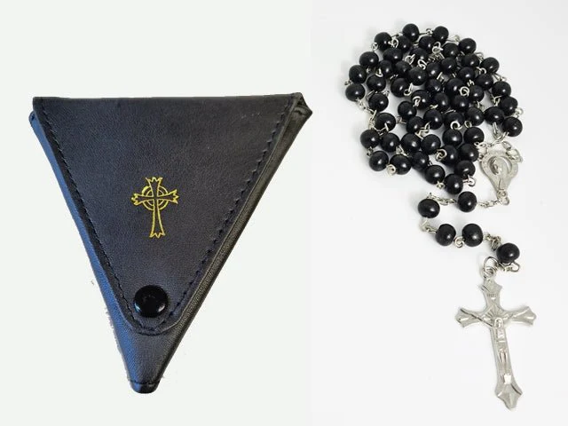 The compact triangular design gently holds the rosary and prevents tangling, making it a practical pouch for everyday use or when carrying a rosary in a pocket or bag.
